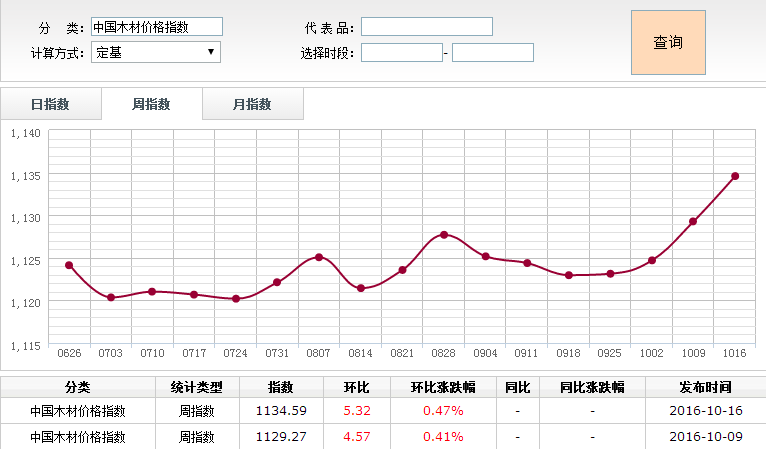 中国木材价格指数(CTI)本周报收1134.59点,周环比上升5.32点,涨幅为0.47%。其中福人木材价格指数(FTI)报收1272.48点,周环比上升7.23点,涨幅为0.57%;鱼珠木材价格指数(YTI)报收1036.17点,周环比上升6.77点,涨幅为0.66%;大西南木材价格指数(CTI)报收1055.66点,周环比下跌1.4点,跌幅为0.13%。