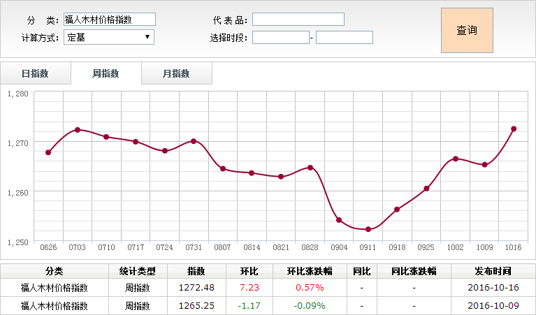 上海福人木材价格指数(FTI)报收1272.48点,周环比上升7.23点,涨幅为0.57%。