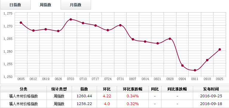 上海福人木材价格指数(FTI)本周报收1260.44点,周环比上升4.22点,涨幅为0.34%。