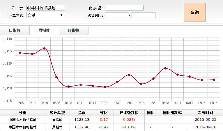 本周中国木材价格指数(CTI)报收1123.13点,周环比上升0.17点,涨幅为0.02%。其中福人木材价格指数(FTI)报收1260.44点,周环比上升4.22点,涨幅为0.34%;鱼珠木材价格指数(YTI)报收1028.75点,周环比上升1.68点,涨幅为0.16%;大西南木材价格指数(DTI)报收1037.27点,周环比下跌10.95点,跌幅为1.04%。