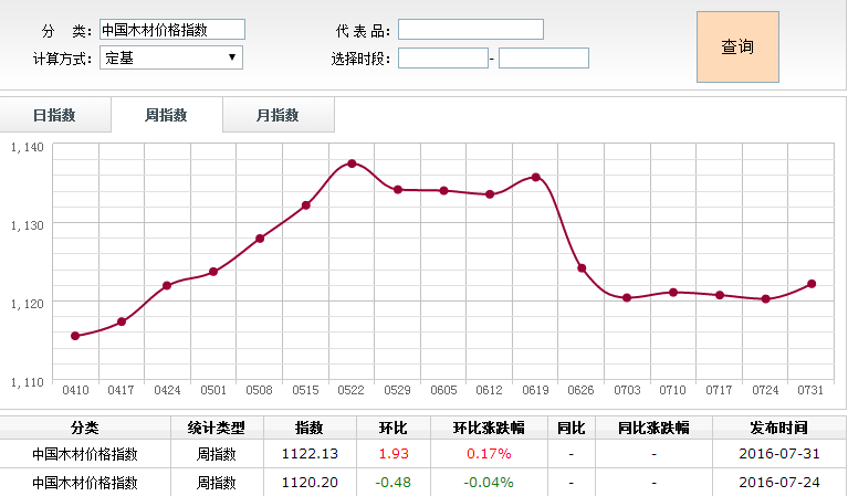 本周中国木材价格指数(CTI)报收1122.13点,周环比上升1.93点,涨幅为0.17%。其中其中福人木材价格指数(FTI)报收1269.97点,周环比上升1.92点,涨幅为0.15%;鱼珠木材价格指数(YTI)报收1036.72点,周环比上升1.03点,涨幅为0.1%;大西南木材价格指数(DTI)报收997.26点,周环比上升3.72点,涨幅为0.37%。