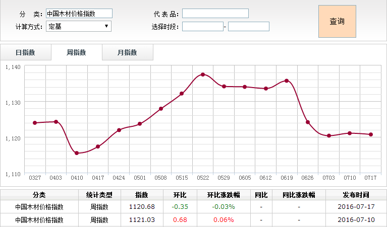 本周中国木材价格指数(CTI)本周报收1120.68点,周环比下跌0.35点,跌幅为0.03%。其中福人木材价格指数(FTI)报收1269.87点,周环比下跌0.98点,跌幅为0.08%;鱼珠木材价格指数(YTI)报收1034.85点,周环比上升6.44点,涨幅为0.63%;大西南木材价格指数(DTI)报收993.98点,周环比下跌12.67点,跌幅为1.26%。