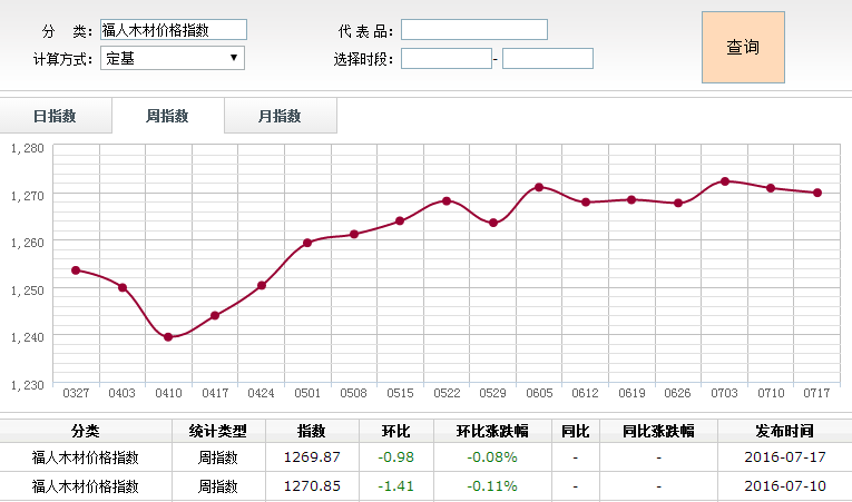 上海福人木材价格指数(FTI)报收1269.87点,周环比下跌0.98点,跌幅为0.08%。