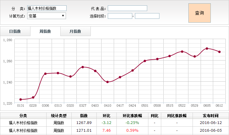 本周上海福人木材价格指数(FTI)报收1267.89点,周环比下跌3.12点,跌幅为0.25%。受端午假期的影响,本周以来木材市场总成交量略有下滑。