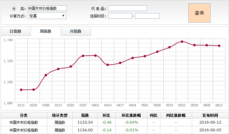 本周中国木材价格指数(CTI)报收1133.54点,周环比下跌0.46点,跌幅为0.04%。其中福人木材价格指数(FTI)报收1267.89点,周环比下跌3.12点,跌幅为0.25%;鱼珠木材价格指数(YTI)报收1029.32点,周环比下跌2.67点,跌幅为0.26%;大西南木材价格指数(DTI)报收1073.27点,周环比上升9.25点,涨幅为0.87%。