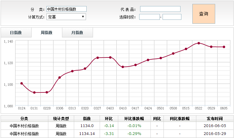 本周中国木材价格指数(CTI)报收1134.0点,周环比下跌0.14点,跌幅为0.01%。其中福人木材价格指数(FTI)报收1271.01点,周环比上升7.46点,涨幅为0.59%;鱼珠木材价格指数(YTI)报收1031.99点,周环比上升3.05点,涨幅为0.3%;大西南木材价格指数(DTI)报收1064.02点,周环比下跌21.7点,跌幅为2%。