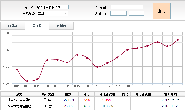 本周上海福人木材价格指数报收1271.01点,周环比上升7.46点,涨幅为0.59%。截止上周五,根据上海福人市场提供出货数据,板材、地板胚料、红木等均有略微变化。