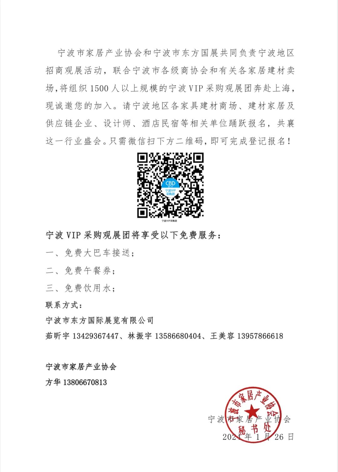 宁波市家居产业协会和宁波市东方国展共同负责宁波地区招商观展活动,联合宁波市各级商协会和有关各家居建材卖场,将组织1500人以上规模的宁波VIP采购观展团奔赴上海,现诚邀您的加入。请宁波地区各家具建材商场、建材家居及供应链企业、设计师、酒店民宿等相关单位踊跃报名,共襄这一行业盛会。只需微信扫下方二维码,即可完成登记报名!