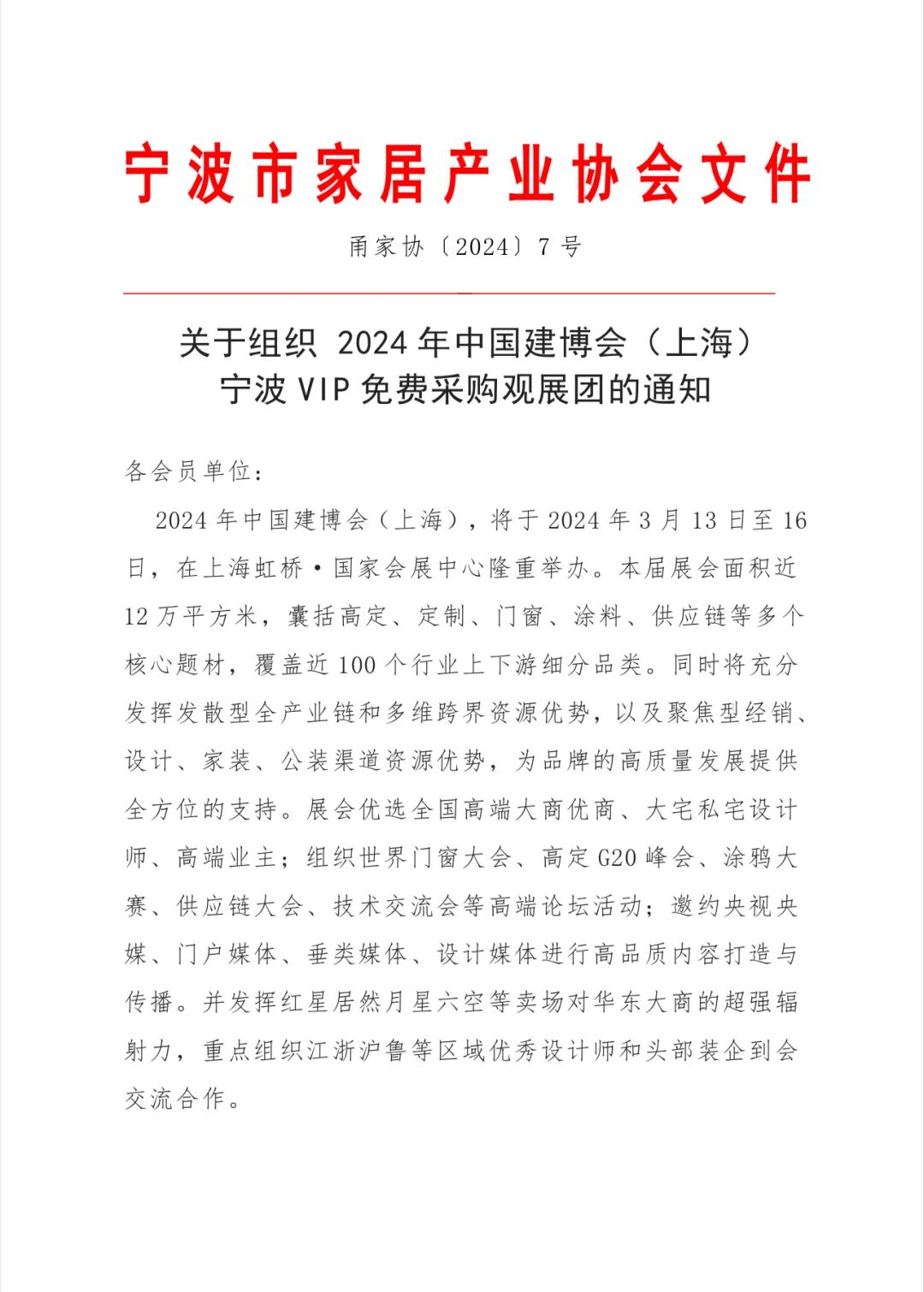 甬家协〔2024〕7号关于组织 2024年中国建博会(上海)宁波VIP免费采购观展团的通知