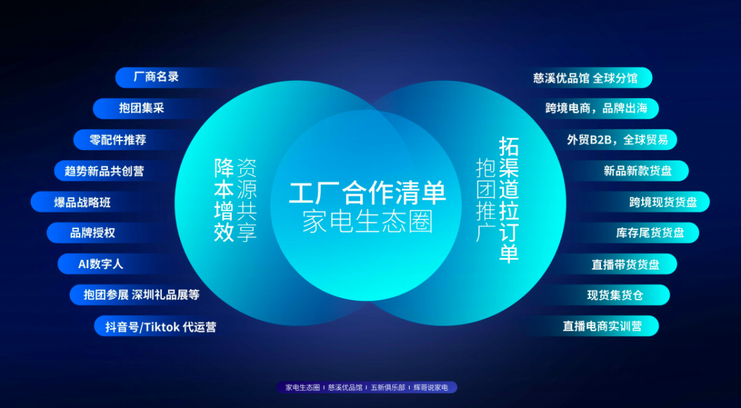 余雪辉详细阐述了慈溪家电产业带目前面临的四大痛点,分别从内外贸关系、实体经济与数字经济强弱对比、生产研发对比、产品与品牌的关系四个角度阐述了慈溪小家电产业所面临的困境。如何破局成为他和团队思考的重点,他们分别从在线交易系统的打造,直播赋能、产品研发赋能、助力品牌出海、为中小企业降本增效等方面作出尝试和努力,并取得了良好的效果反馈。在未来将慈溪优品馆升级为慈溪优品仓,与慈溪市政府合力打造家电产业链生态园,为中小企业提供从研发、打样,到标准化生产全流程生产孵化基地。同时引入直播,跨境电商等业务端口,更好地为产业赋能增效。