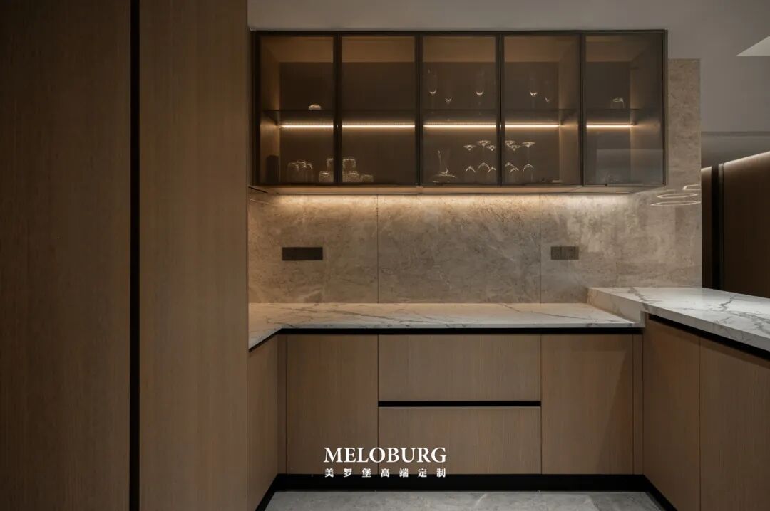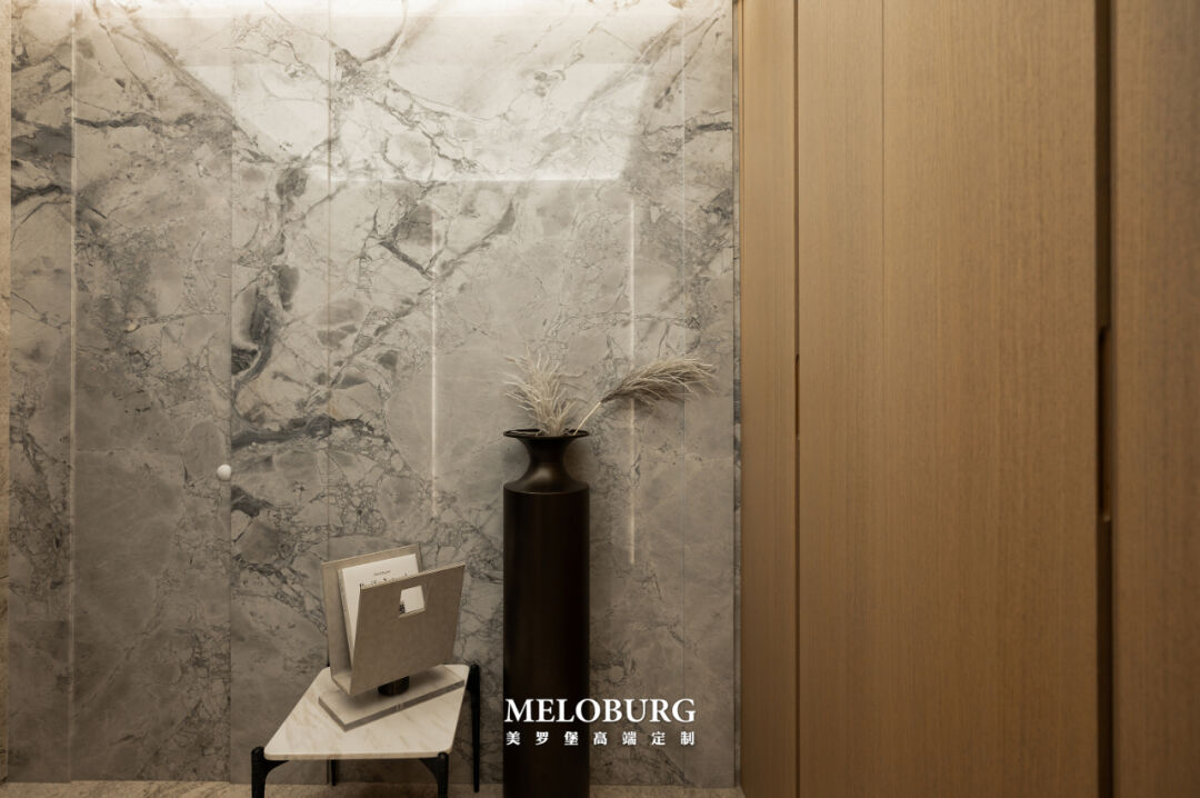 美罗堡:电视柜边柜电视背景墙餐厅衣柜 玄关护墙 房门 全案高定主要材料 | 木皮、岩板、大理石、混油、进口免漆板、玻璃、金属、皮革、布艺、艺术漆、智能照明。