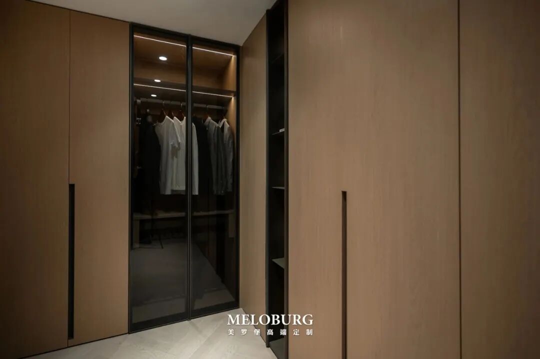 衣帽间依然呼应整个空间的木色设计,转角设计衣柜,最大化利用空间。布局合理,满足日常生活存放需求。干湿分离的卫浴区,拥有利落高级的生活表达。空间干净整洁,带来高品质卫浴生活。