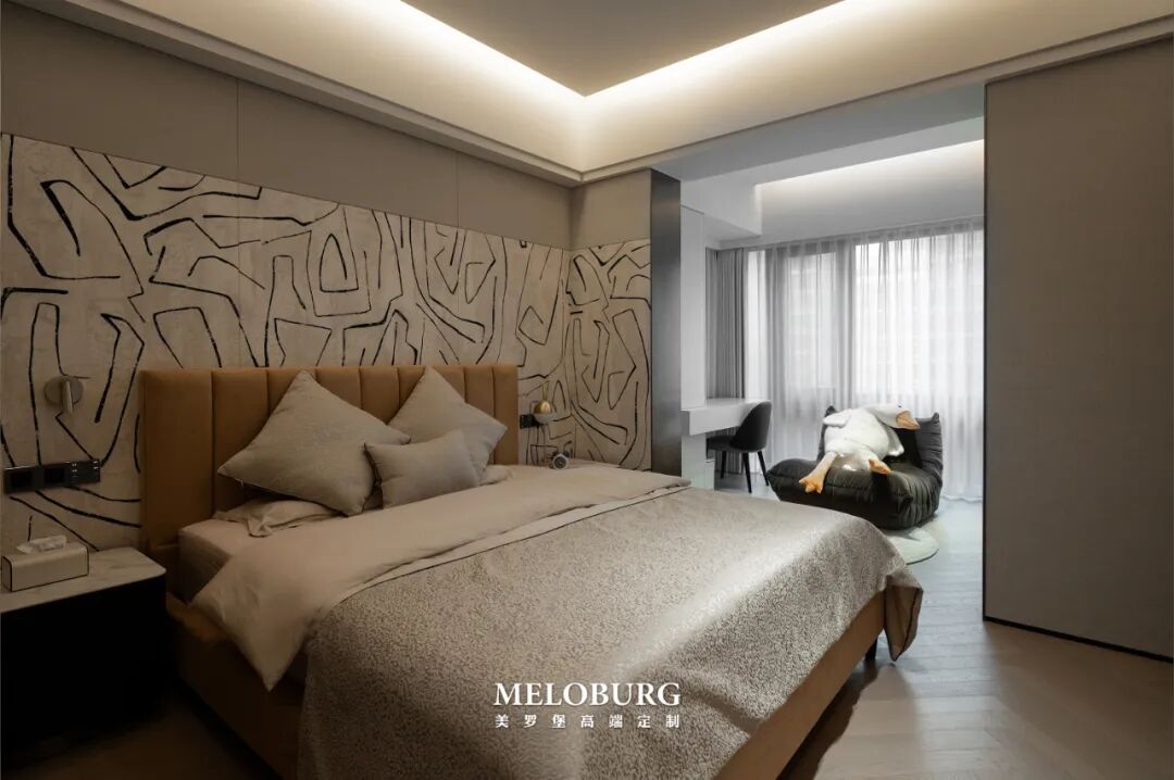 西厨选用温润木纹与水晶宫同色的玻璃吊柜。极简的设计,为生活的自由随性富足赋力。以感观上的纯粹,呈现品味和思想的丰富。通往卧室空间的长廊,采用同色木纹,为留白空间的尺度,极具优雅的简,是设计驾轻就熟的利落。Indifferent romantic,detached life主卧也以极简的调性,散发着精简与克制之美,空间灵活开放自由的居住体验,保持纯净的状态,达到美与功能的平衡。强调静谧与柔和,透过温和奢雅的肌理营造气质与温度,让心灵得到静谧的洗涤,过滤情绪。弧形落地窗的创意设计,在空间视觉上更具延伸感,使视觉空间更加开阔。同时让居住更加舒缓浪漫。一座面包型双人沙发,可坐可卧。生活的精致与浪漫,在细节中得以窥见。女孩房暖色调更富有温柔与恬静。一幅抽象的几何画绒布陈列于床头背景,让整个空间更具时尚艺术的气息。置身其中,一切都回归最真实的恬淡心境。