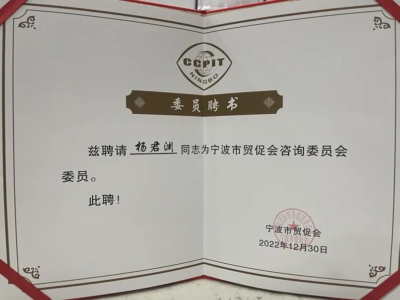 杨君渊受聘为宁波市贸促会咨询委员会委员