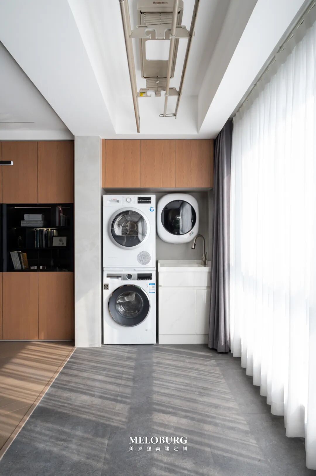 阳台不仅是阳光普照的大门,而且也是主人浣衣的功能区域,小小的一角打造了完整的洗烘消系统功能。