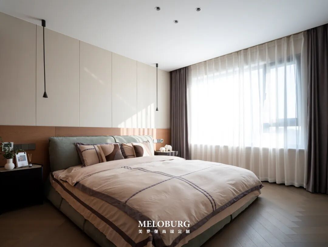 行至主卧内,白色+木质烘染出素雅自然之意味,不张扬不耀眼,温温柔柔地,讲述着生活和岁月。微风浮动窗幔,日光趁机钻进室内,日子晃晃悠悠,生活有滋有味。