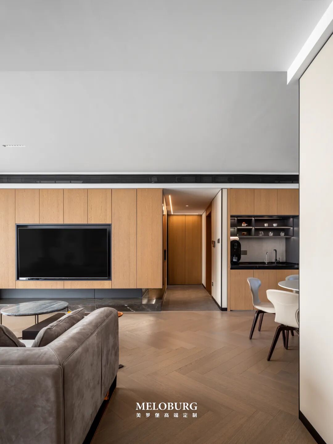 门厅处与客厅电视墙形成大L型设计,木色面板上镶嵌墨色玻璃收纳格与墨色烤漆开放柜,整个悬空设计与地面深色岩板台面天地呼应,沉稳而大气,灵动而时尚。