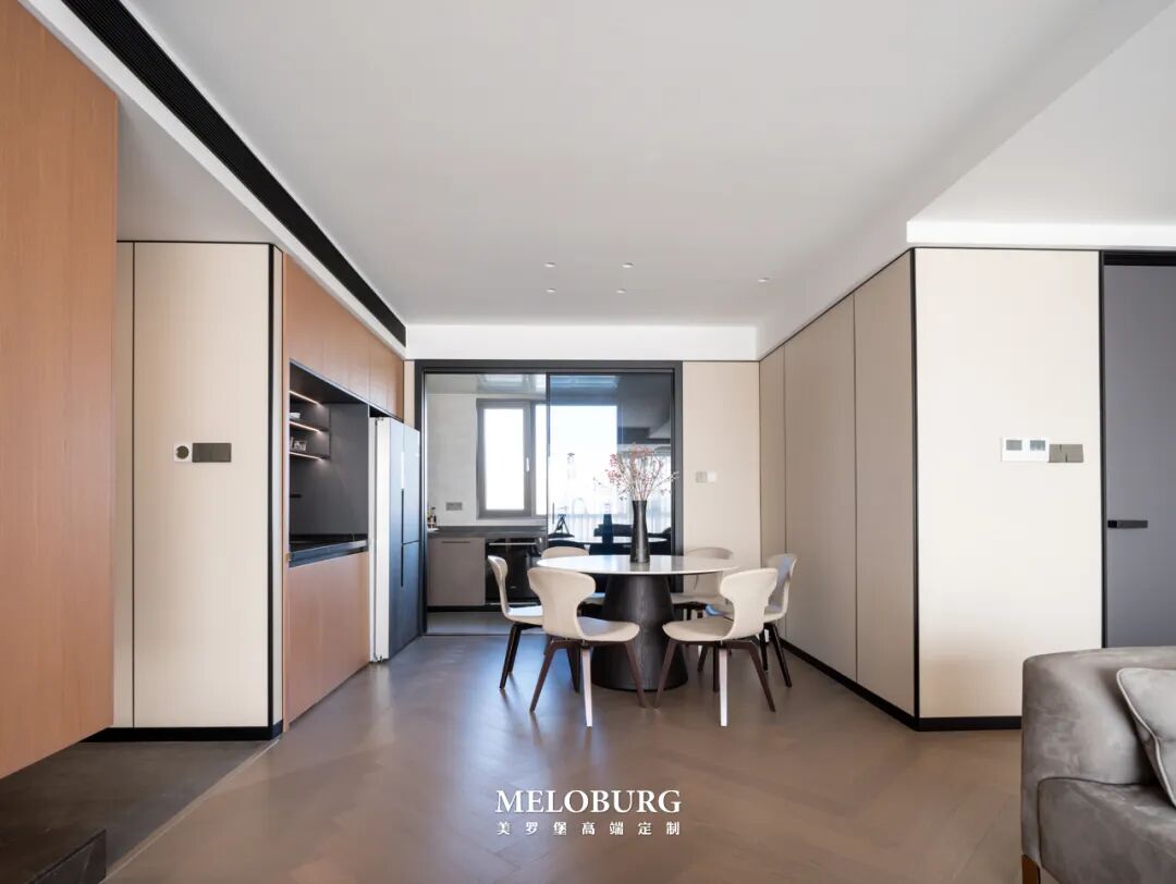 用餐区域设置精致收纳的西厨水台,墨色内敛、木色亲和。搭配浅色岩板桌面和米白色座椅,视觉上层次分明,色彩跳跃,整个空间富有洒脱的灵动之美。