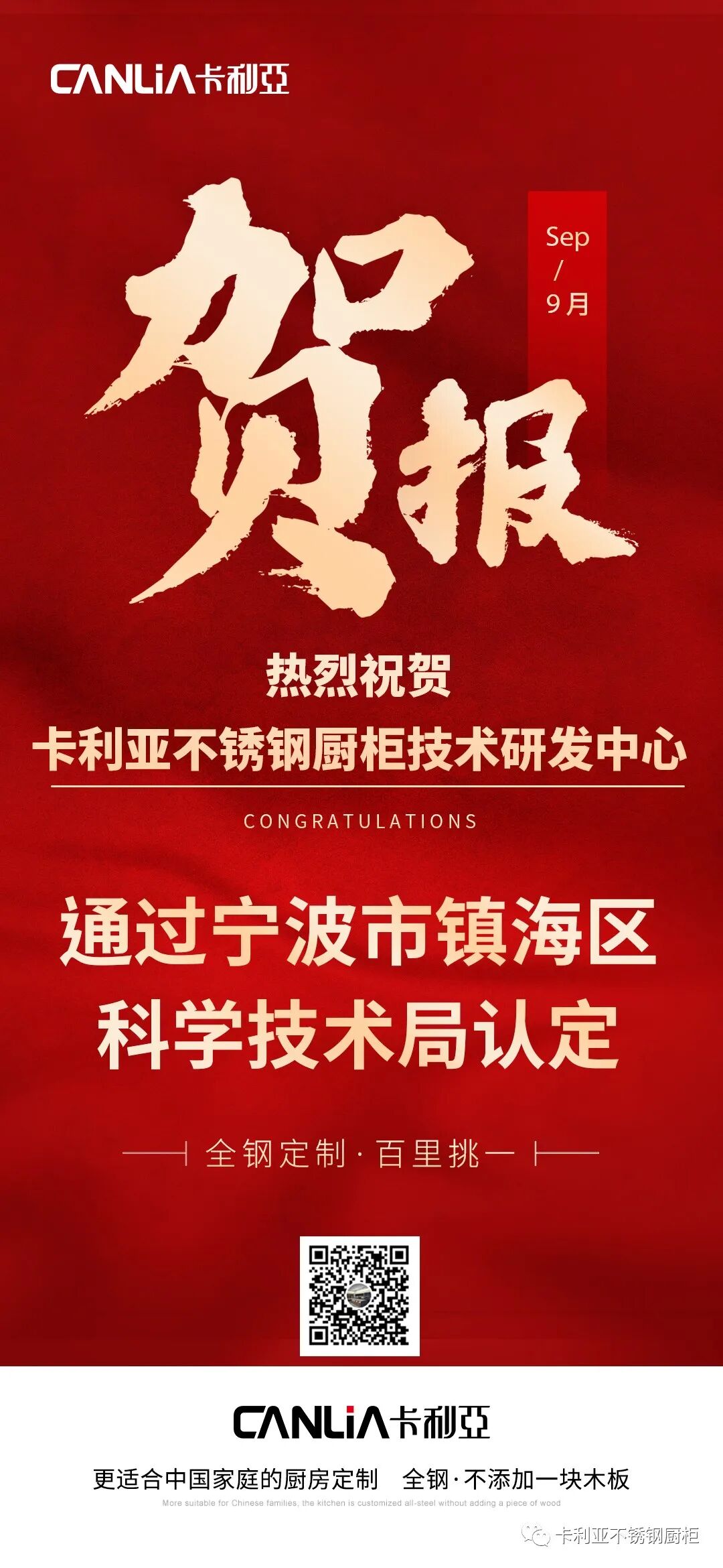 热烈祝贺卡利亚不锈钢厨柜技术研发中心通过宁波市镇海区科学技术局认定