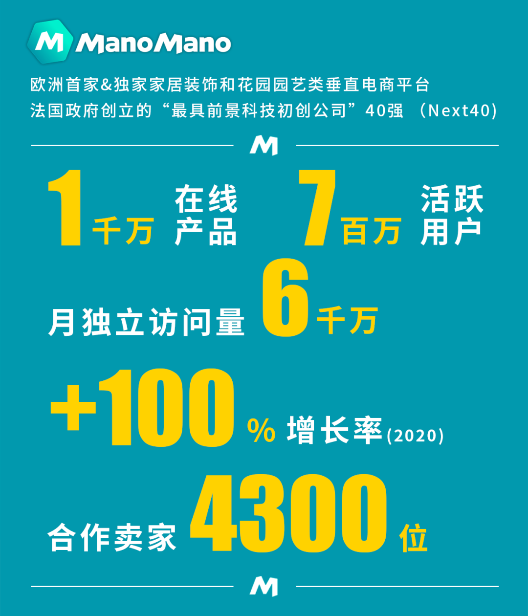 “ManoMano”是欧洲首家&独家家居装饰和花园园艺类垂直电商平台、法国政府创立的“最具前景科技初创公司”40强。平台深耕家居装饰&花园园艺类产品,拥有强大、高效的引流获客系统算法和运营管理工具,并在欧洲五国(法、德、英、西、意)拥有直接的线上销售渠道,在全球拥有超过4300多个合作卖家和1千多万种不同的在线产品,7百万的活跃用户以及5千万月独立访问量,同时ManoMano拥有超过1000名全职员工来保证平台的稳定和对卖家的优质服务,并推出官方仓服务Mano Fulfilment,帮助中国卖家解决大件家具物流的后顾之忧。2021年七月ManoMano完成3.55亿美元F轮融资,跃然成为独角兽企业。下一步,ManoMano将保持筛选制的传统入驻政策,加大对中国卖家的招商力度,并为其提供法国、德国、英国、意大利、西班牙和比利时市场的新机遇。