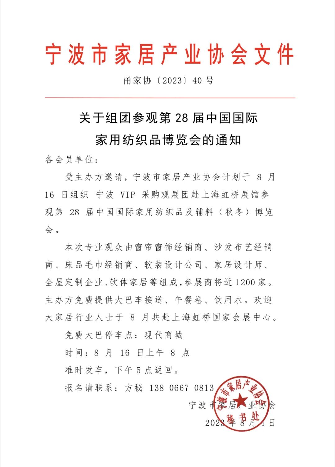 受主办方邀请,宁波市家居产业协会计划于8月16日组织 宁波 hVIP 采购观展团赴上海虹桥展馆参观第28届中国国际家用纺织品及辅料(秋冬)博览会。