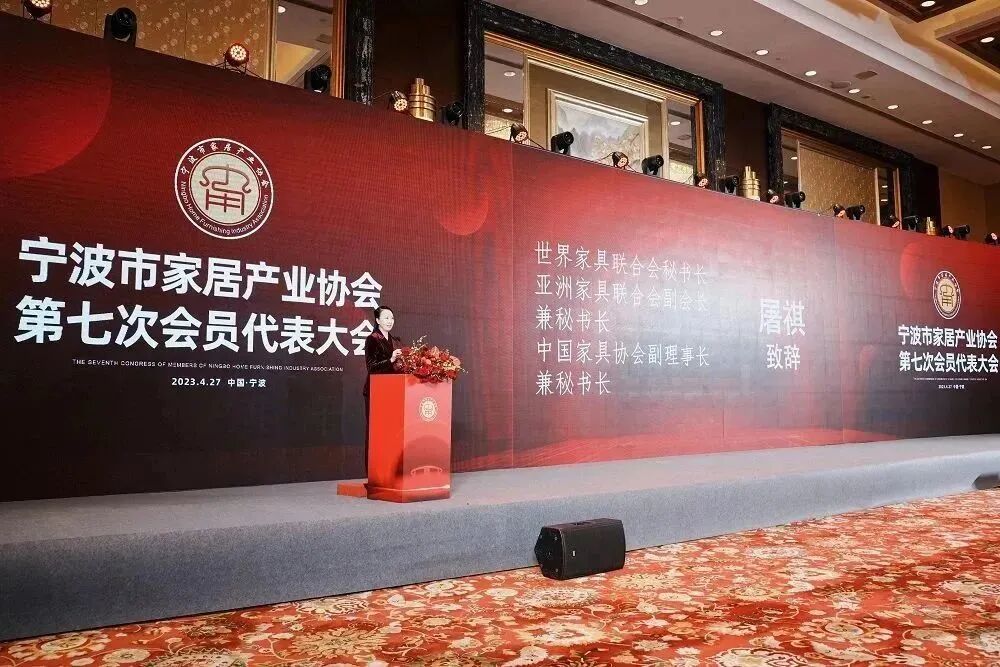 2023年4月27日,宁波市家居产业协会第七届会员代表大会在香格里拉大酒店隆重举行。宁波迎来了近年来最高规格的家居产业盛会。中国家具协会副理事长兼秘书长屠祺,宁波市工商联党组成员、副主席、市商会副会长吴益统,宁波市贸促会党组成员、副会长叶华育,宁波市市场监督管理局党委委员、副局长车宏斌,宁波市社会组织管理局局长史浩明等领导到会并讲话。