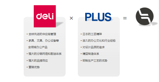 基于国内的现状,得力与PLUS的进行深度合作,一个拥有广泛的品牌认知度,一个拥有扎实的历史积淀。双方在产品的开发、生产以及销售等各维度强强联手,以原创、适用、效率、信赖、鼓舞、人本作为品牌基因, 打造出一个全新的品牌——得力普乐士,以“One For All (众智一心,一心为众)”为愿景,为客户提供一站式办公解决方案,致力于成为办公家具行业的消费者品牌。