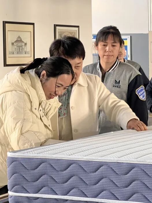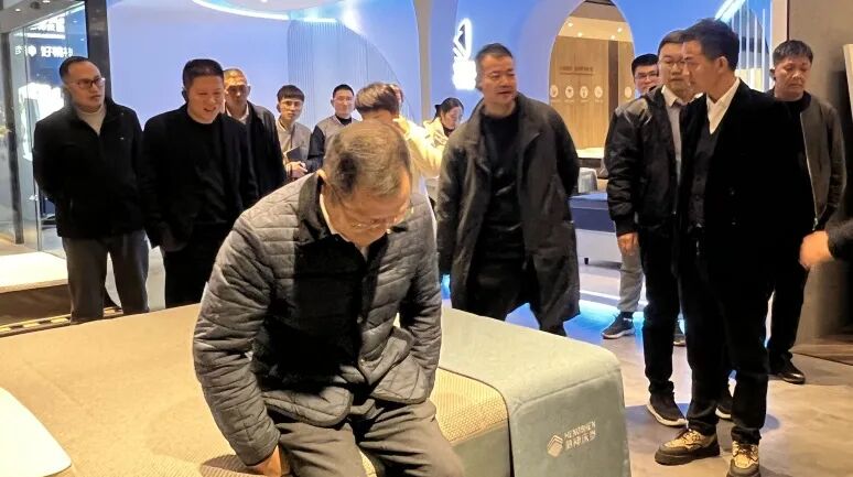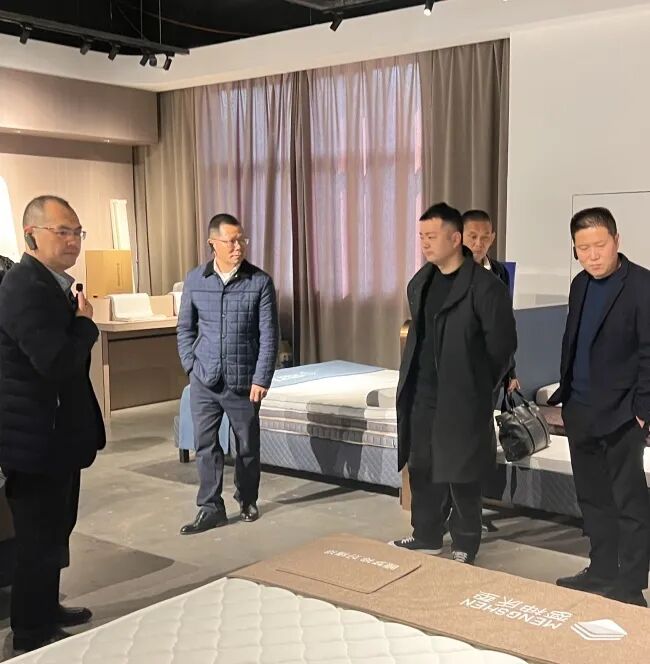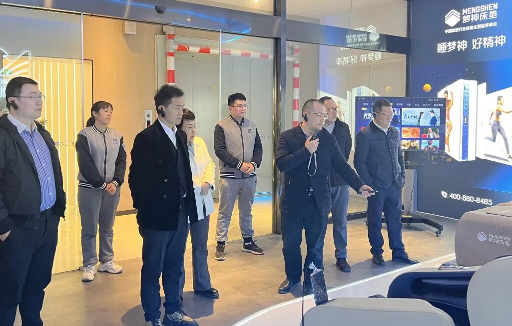 随后,杨会长一行参观了品牌展厅,总经理马建强对床垫产品特性、适用场景等作了详细解说。