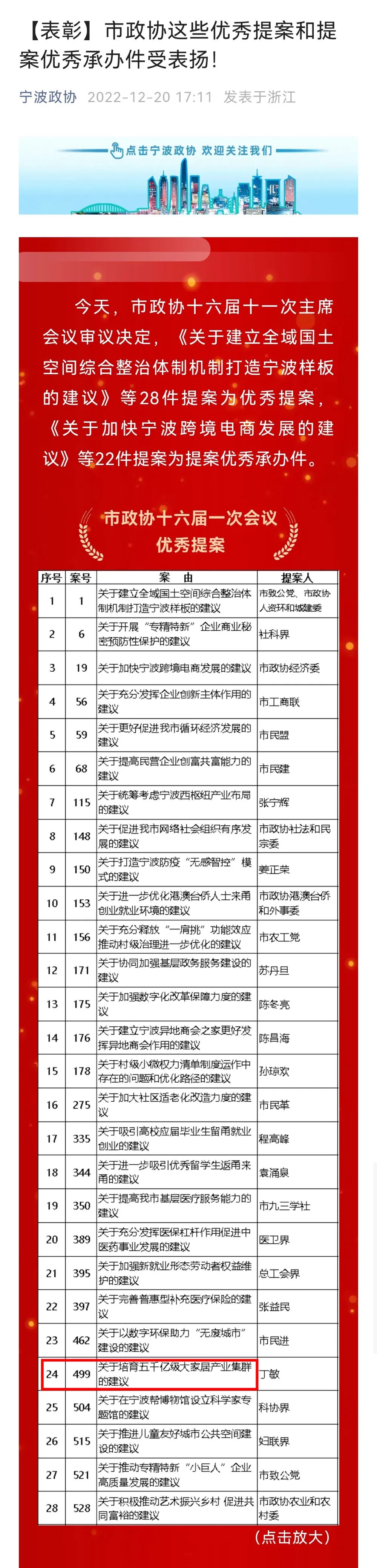 2022年12月20日,宁波市政协十六届一次会议优秀提案公布。由宁波市政协委员、宁波市商会副会长、宁波市家居产业协会会长丁敏领衔协会秘书处提案团队提交的《关于培育五千亿级大家居产业集群的建议》获评优秀提案。