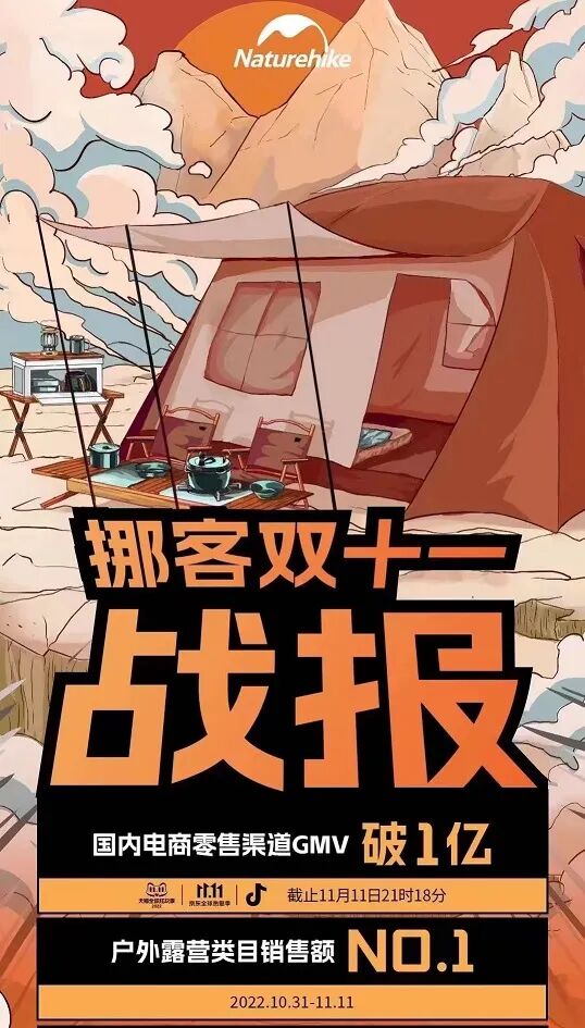 Naturehike浙江挪客运动用品有限公司双11国内电商零售渠道GMV破1亿。户外露营类目销售排名第一。国内电商零售全渠道全渠道同比增长120%。天猫全球狂欢季2022销售额增长100%+,京东全球热爱季销售额增长260%+,2022年度双十一勇创挪客Naturehike历年双十一最佳战绩。