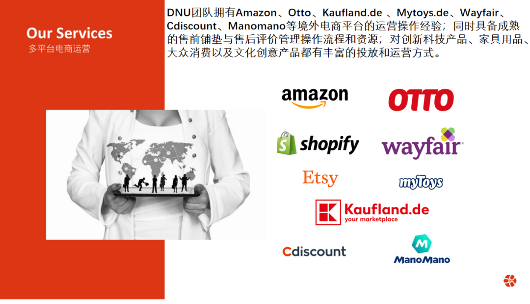 德宁DNU团队拥有Amazon、Otto、Kaufland.de 、Mytoys.de、Wayfair、Cdiscount、Manomano等境外电商平台的运营操作经验;同时具备成熟的售前铺垫与售后评价管理操作流程和资源;对创新科技产品、家具用品、大众消费以及文化创意产品都有丰富的投放和运营方式。