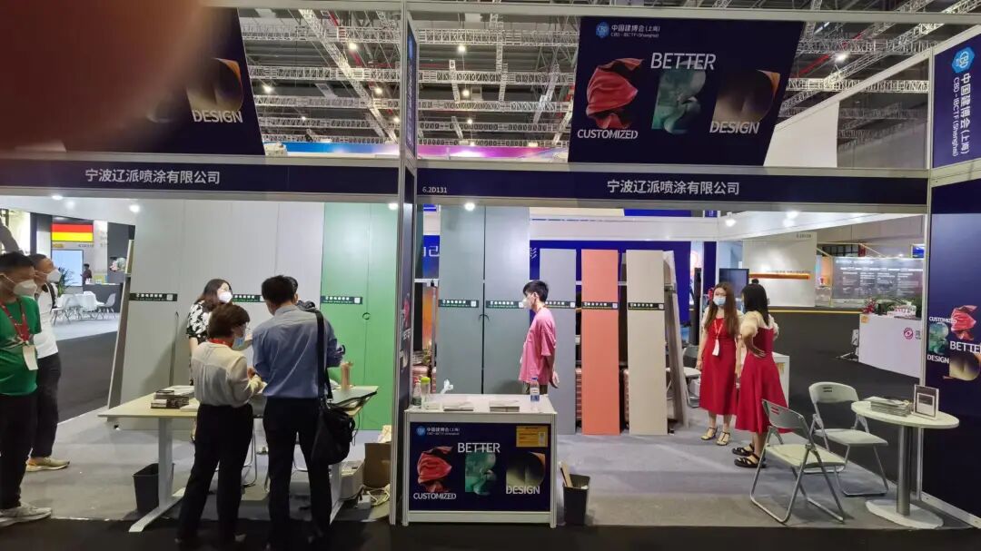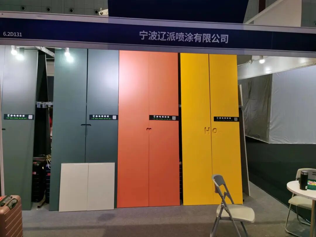 宁波辽派喷涂有限公司参展全屋定制门板的潮流新产品一静电喷粉门板。静电喷粉门板具有零 VoC 、零甲醛、零重金属。防水、防潮、防霉、防污、耐老化耐刮擦、抗腐蚀、硬度高、不易变形六面无缝、自由设计,色彩丰富,稳定性高的特点。