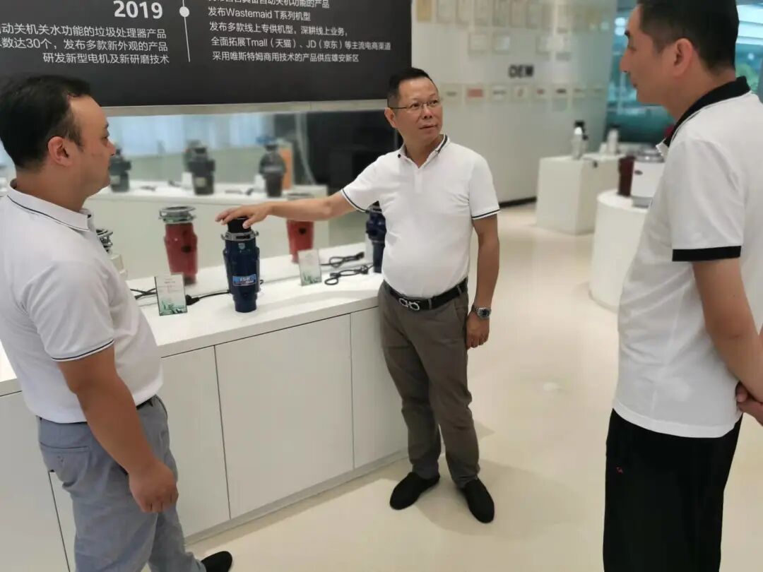 品牌负责人董耀带领大家参观了产品展示厅并介绍了公司的品牌发展之路。公司的食品垃圾处理器远销海内外市场,年销售额已经超过3亿元,位列全球前三位。公司已与多家国际及国内头部企业展开业务合作,已成为这些品牌企业的食品垃圾处理器的重要供货商。