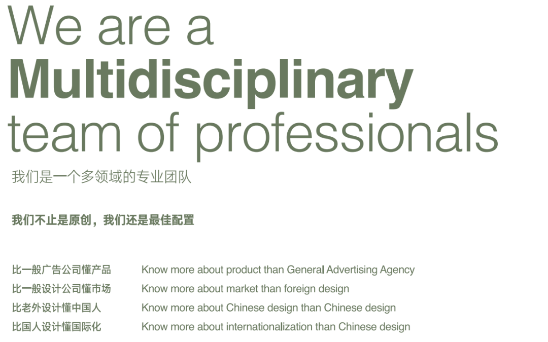 设计制作优势:国外设计师实体整合输出平台,通过对设计需求的整理匹配合适的设计团队(国内外设计师)并且对设计预算,出品,执行全程监控,增强设计对针性和落地性。