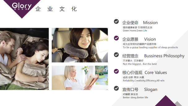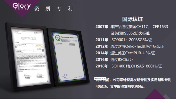 2008年创建百思佳品牌,2012年被评为上海名牌。产品符合美国CFR1633、英国BS5852、BSCI、ISO9001等标准,并通过美国CertiPUR-US认证、欧盟Oeko-Tex认证。