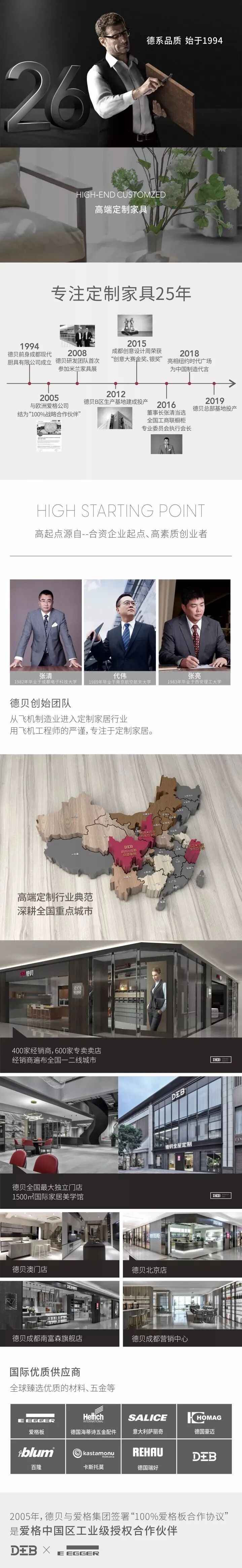 德贝前身成都现代厨具有限公司成立于1994年,专注定制家具已25年,德贝创始团队从飞机制造业进入定制家居,用飞机工程师的严谨专注于定制家居,全国有400多家经销商,600多家专卖店,经销商遍布全国一二线城市,1000多个楼盘200000套精装房,是高端精装楼盘喜爱的家居配套供应商。德贝轻奢定制产品有极简轻奢、工业风、欧式、新中式4大风格。