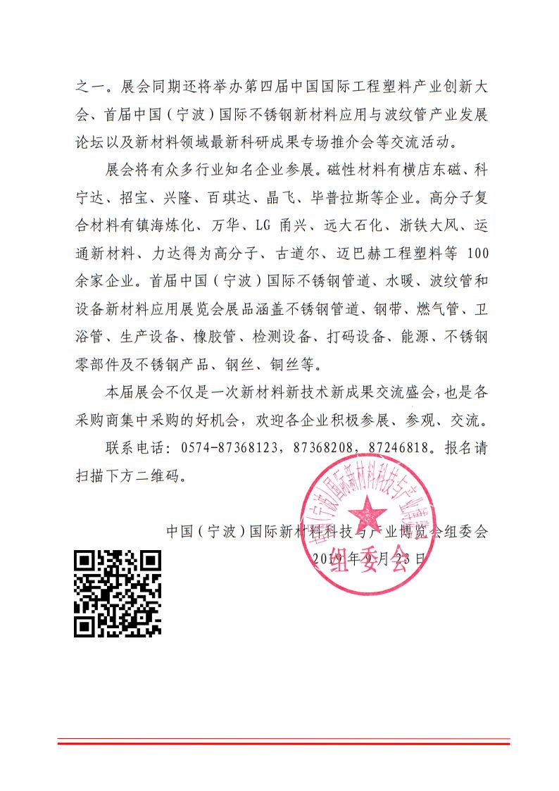 展会同期还将举办2019中国(宁波)新材料产业发展论坛、2019第四届中国国际工程塑料产业创新大会、2019中国国际功能高分子应用创新大会、首届中国(宁波)国际不锈钢新材料应用与波纹管产业发展论坛、2019宁波国际电容器技术高峰论坛、新材料领域最新科研成果专场推介会、新材料学术研讨交流活动、产业对接会、院士专家企业行等高端活动。