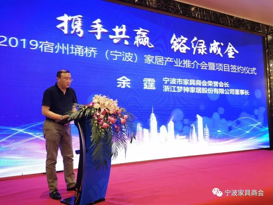 商会荣誉会长、梦神集团董事长余霆先生表示,感谢宿州市领导对宁波市家具商会的信任,带来了那么好的合作机会,宁波有着丰富、完整的家具产业链。从经济总量来看,至2018年底,宁波市共有家具生产企业、经销商、服务企业3千多家,相关配套企业200多家,从业人员突破7万人,年产值过亿的企业27家,其中规上企业总产值136亿,宁波宿州两地优势互补,合作带来更多商机,必然会创造出更美好的明天!