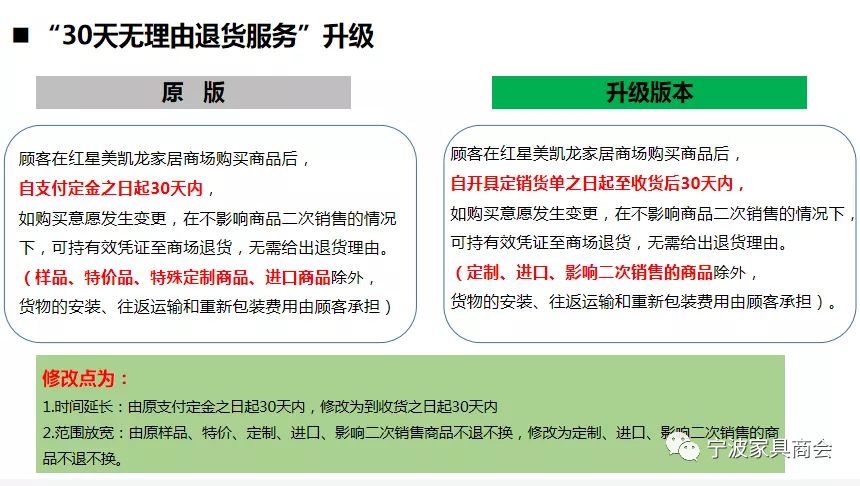2019年红星美凯龙“星承诺 心服务”再升级。这次升级之后的“30天无理由退货服务承诺”,变更了退货范围,扩大了顾客的选择权。