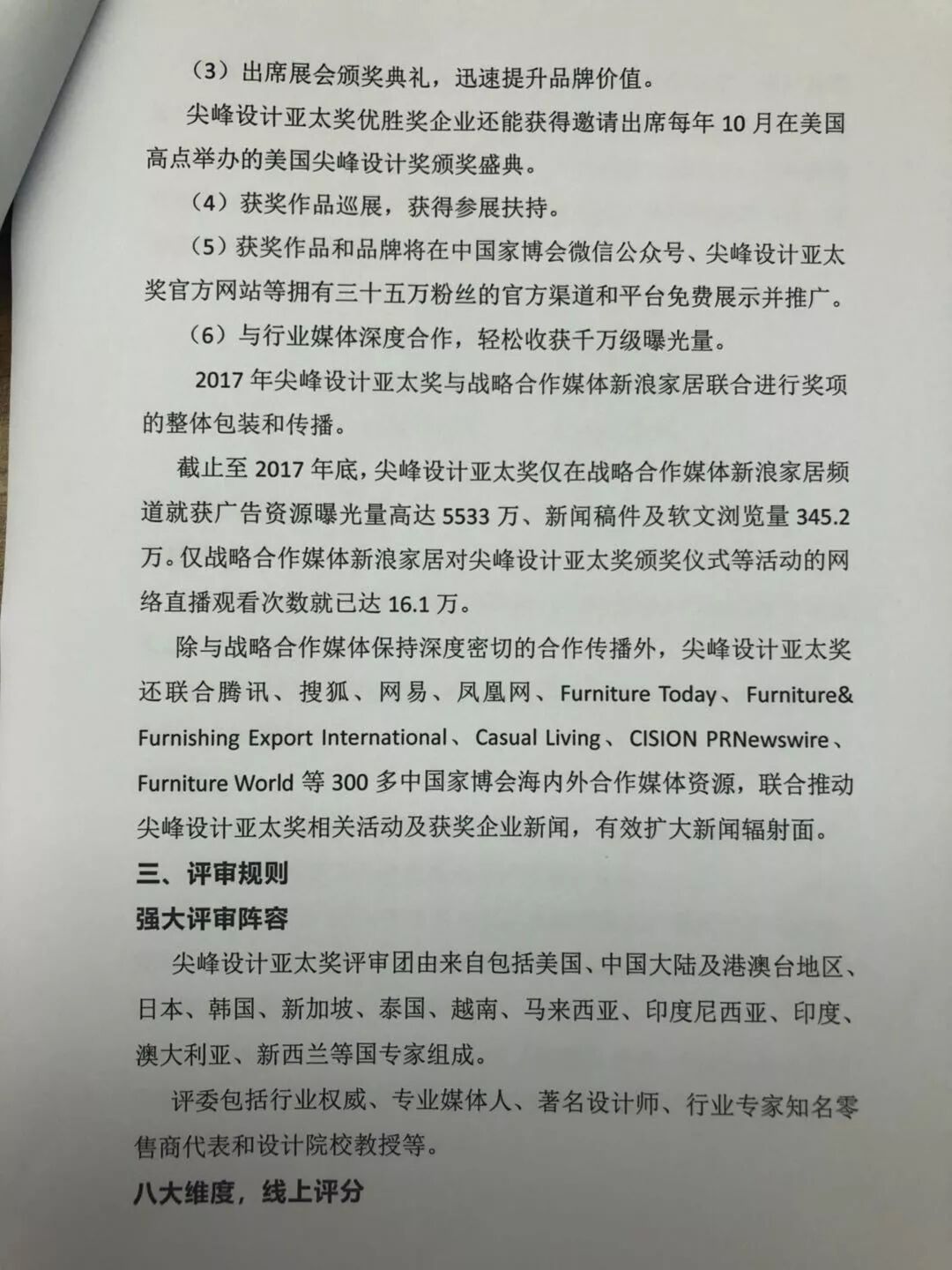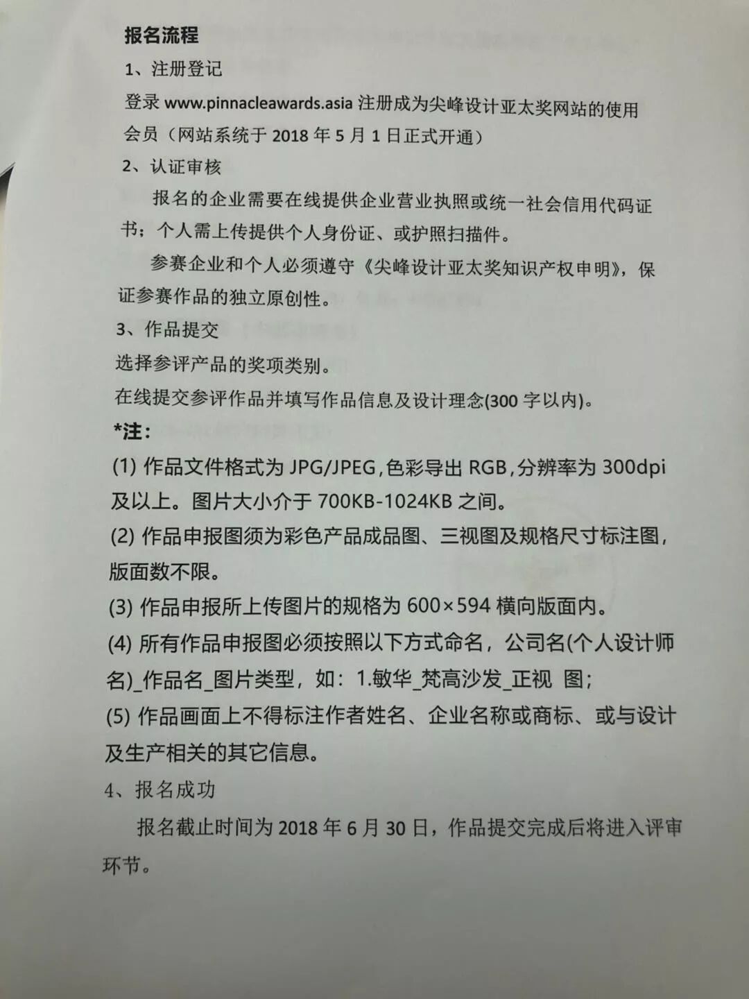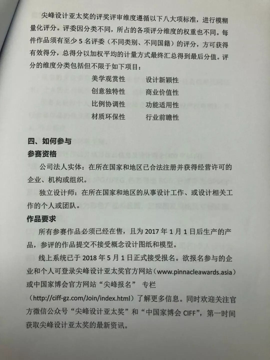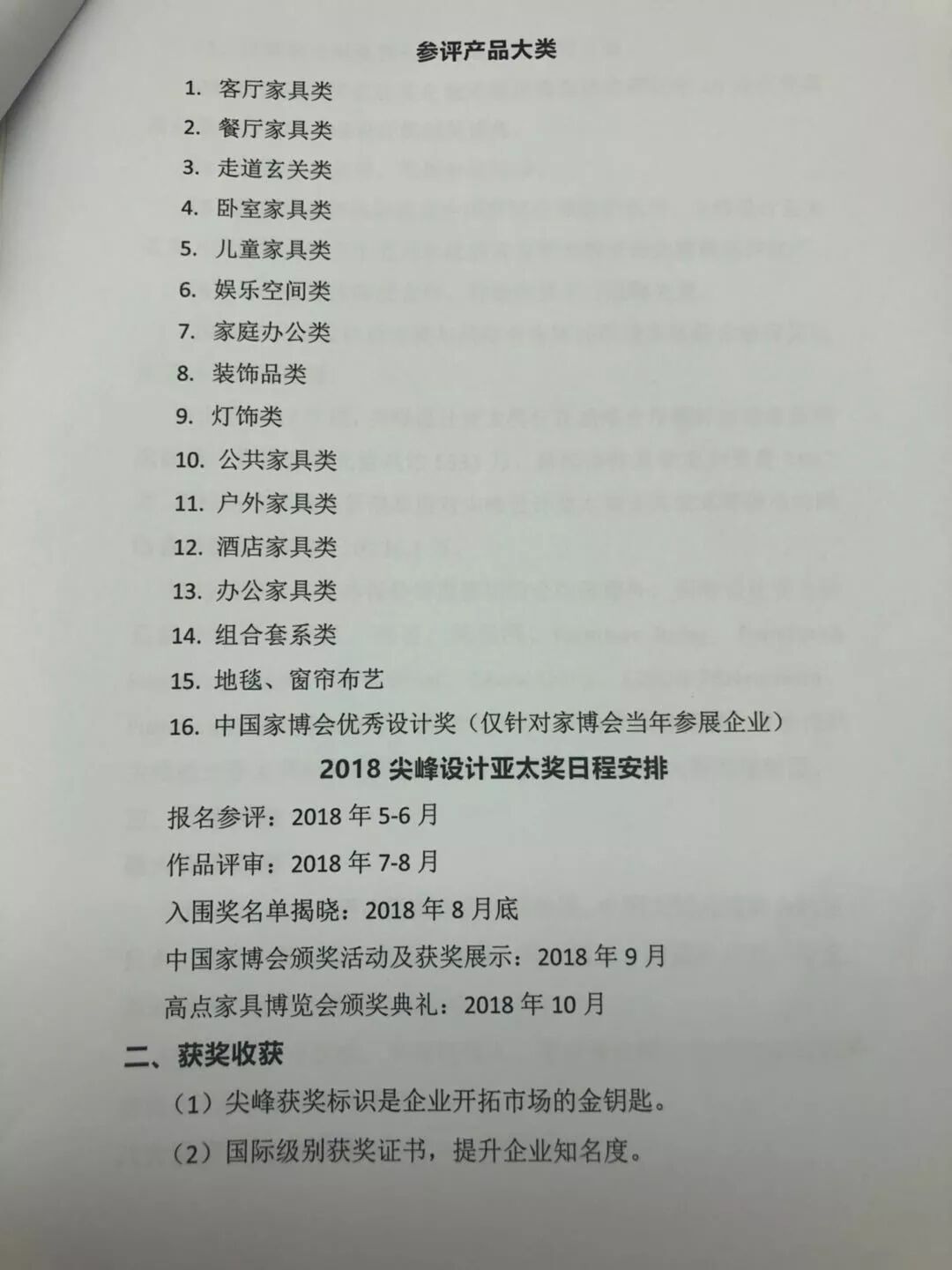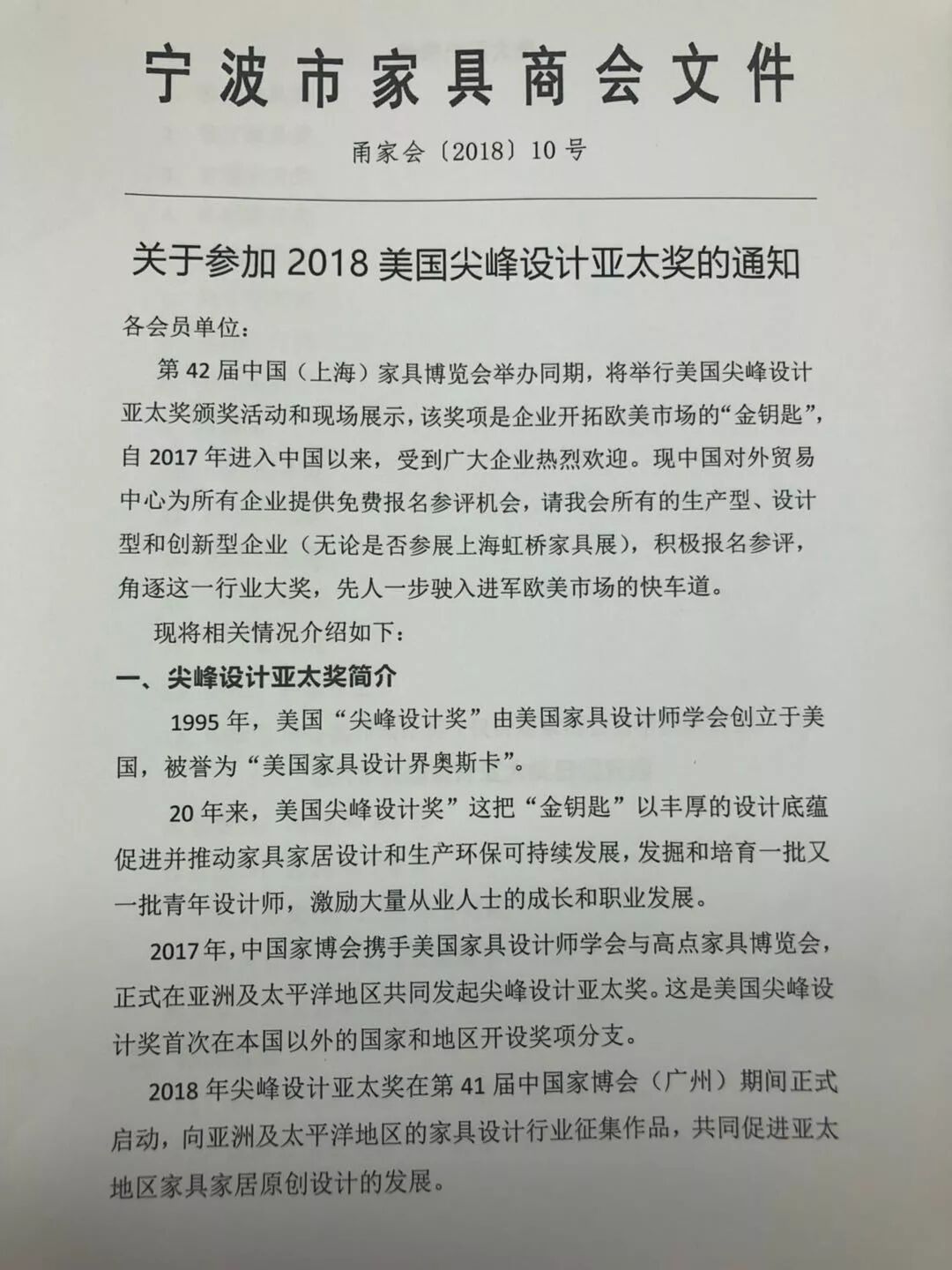 第42届中国(上海)家具博览会举办同期,将举行美国尖峰设计亚太奖颁奖活动和现场展示,该奖项是企业开拓欧美市场的“金钥匙”,自2017年进入中国以来,受到广大企业热烈欢迎。现中国对外贸易中心为所有企业提供免费报名参评机会,请我会所有的生产型、设计型和创新型企业(无论是否参展上海虹桥家具展),积极报名参评,角逐这一行业大奖,先人一步驶入进军欧美市场的快车道。