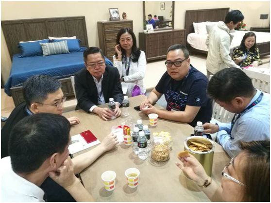 3月11日宁波家具商会副秘书长梅发爱先生,马来西亚家具总会总会长蔡春才先生,厦门我在家软件公司CEO赵启明先生与浙江朗通家具董事长钟新飞先生在交流家具行业的未来发展。