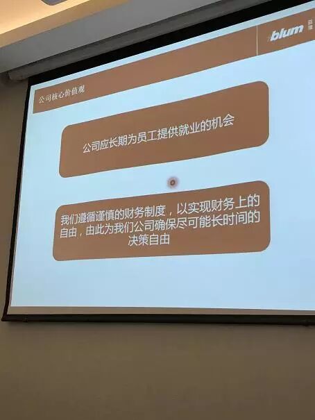 午餐后,百隆浙江分公司总经理陈浩军先生给我们带来了“精神大餐”,解读百年企业百隆的企业文化和管理精髓,让大家零距离了解到奥地利百年企业百隆的核心价值观:公司应长期为员工提供就业的机会;我们遵循谨慎的财务制度,以实现财务上的自由,由此为我们公司确保尽可能长时间的决策自由。交流会上,大家纷纷发言,与陈总进行了互动,陈总也一一分享了自己的实战管理经验。