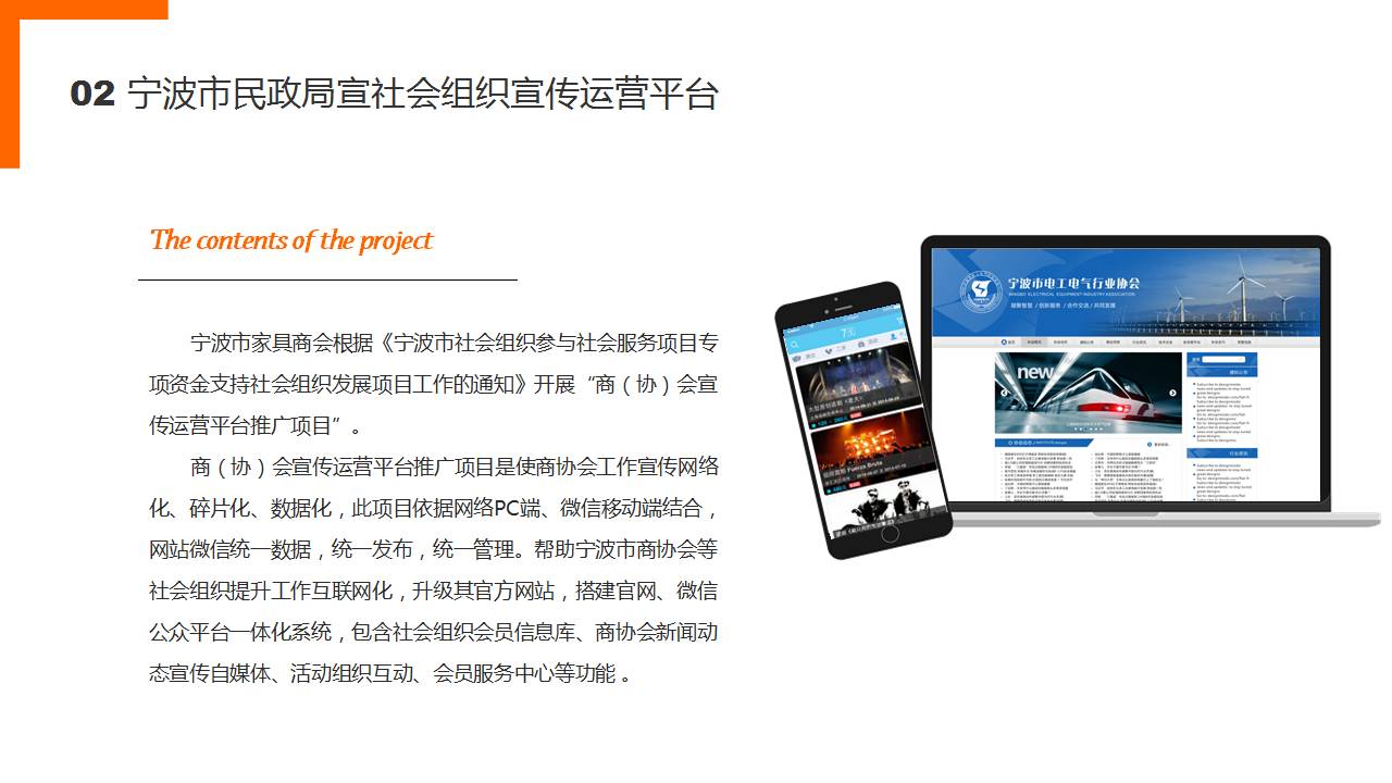 宁波市家具商会自2014年起,承接宁波市民政局关于《宁波市商协会互联网宣传运营平台》项目,其主要目的在于为在甬协会提供PC端网站平台和移动端微信公众平台的搭建。