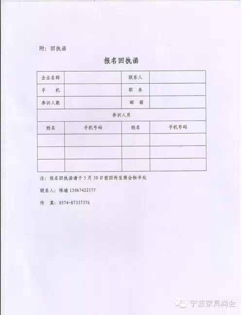 为提升宁波家具市场导购员专业知识和能力、增强家具销售人员的职业技能,商会定于6月23日——25日在溪口大酒店举办家具行业导购员三天三夜封闭式销售培训班,培训现开始报名,报名截止日期:2015年5月30 日。请有意向的企业联系商会秘书处报名。联系人:陈瑜15067422577,郑淘之15967866009。