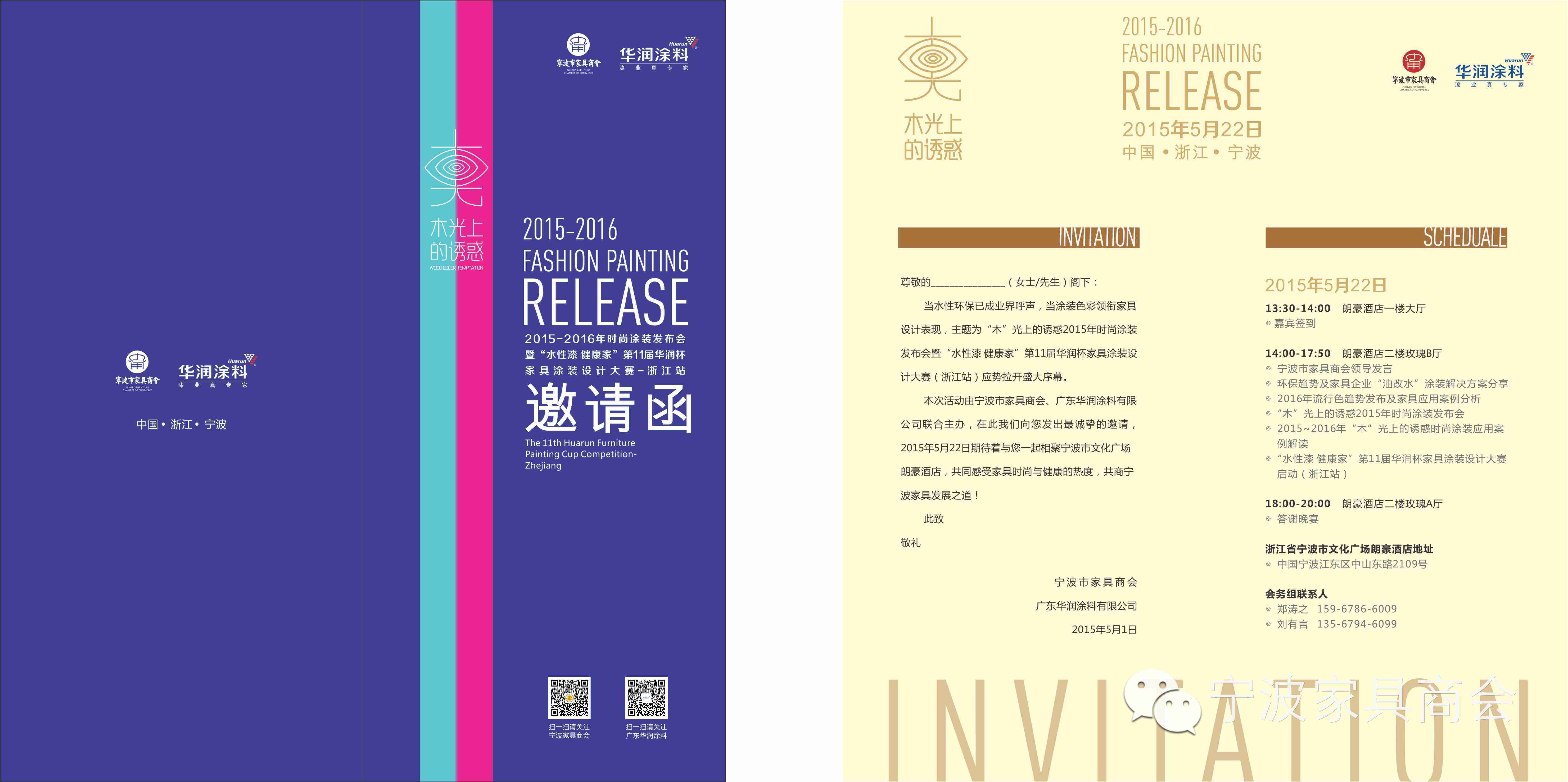 由宁波市家具商会、广东华润涂料联合主办的2015年时尚涂装发布会——“木”光上的诱惑,于5月22日下午1点在宁波市文化广场朗豪酒店二楼玫瑰厅举行。
