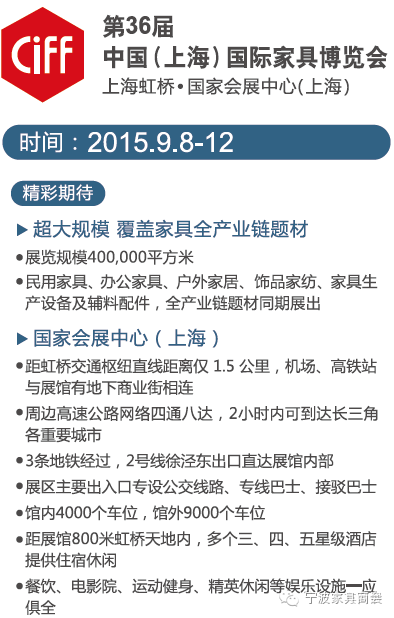 第36届中国(上海)国际家具博览会由宁波市家具商会与宁波市外经贸局、宁波东方国际展览有限公司共同组织,立足产业,服务行业,为参展企业争取更多的政策、价格、宣传优势,结合三方立体优势,对接宁波大、中、小型企业,搭建宁波家具与中外商贸合作的新平台。望广大企业踊跃参展,意向参展企业请与我会联系。