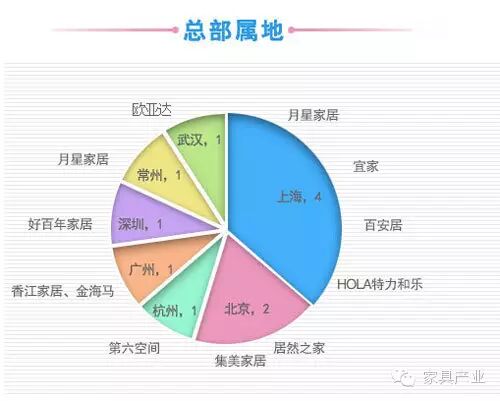 与家居生产型企业聚集在珠三角与长三角一带的分布规律一致,家居连锁卖场发家地也主要集中在了这几个经济发达区域,纳入统计的11家企业,总部在上海占了4家,北京2家,广州、深圳、杭州各1家。这个统计结果在意料之中,出乎意料的是远在北方的长春孕育了吉盛伟邦,和地处中原的武汉崛起了欧亚达。