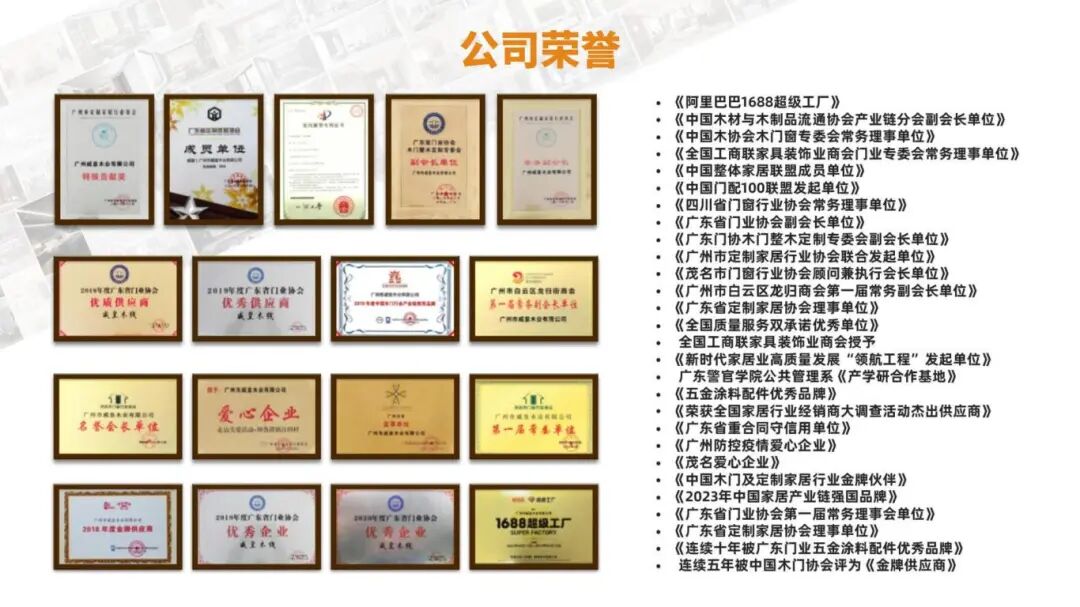 连续十年被广东门业协会授予《五金涂料配件优秀品牌》、连续五年被中国木门窗专业委员会评为《金牌供应商》、《荣获2017-2018连续两届全国家居行业经销商大调查活动杰出供应商》《广东省重合同守信用单位》、《广州防控疫情爱心企业《茂名爱心企业》、《中国木门及定制家居行业金牌伙伴》《2023年中国家居产业链强国品牌》等奖项。
