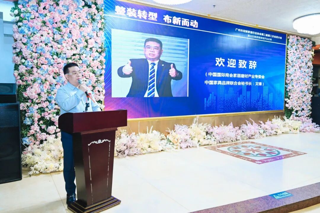 中国国际商会家居建材产业委员会、中国家居品牌联合会秘书长文峰对广州市定制家居行业协会第二届第二次会员大会的胜利召开,表示热烈地庆祝!同时,对合生雅居整装馆的开业,表示衷心地祝贺!在中国整装俱乐部王会长指导下,合生雅居整装馆全面开业,也让我们深入体验到了中国整装行业的发展和进步。在此,请允许我向合生雅居整装馆全体同体同仁再次表示感谢和祝贺!我也真诚地希望,中国国际商会家居建材产业委员会,能够与广州市定制家居行业协会,以及在座的各位家居建材同仁一起,携手同行,共同探讨“整装”发展趋势和前景,共同学习、共同进步!