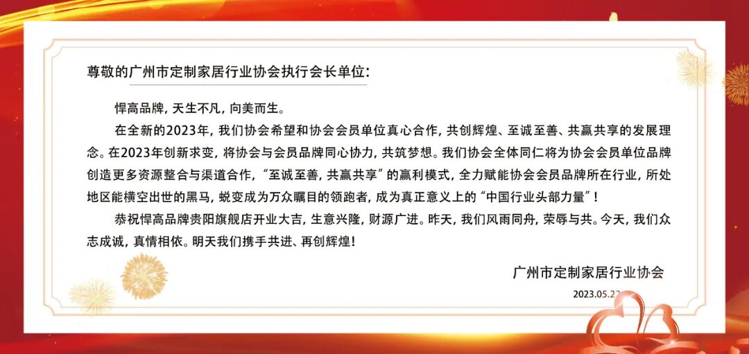 广州市定制家居行业协会执行会长单位悍高品牌贵阳旗舰店总经理李桂祥表示:“回首过去,我们成绩瞩目。展望未来,我们将砥砺前行。感谢悍高总部的持续赋能,让我们得以展翅翱翔,接下来,我们将继续以一流的服务和品质,做大做强,创造更美好的新未来。”